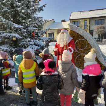 Dzisiaj przedszkolaki z grup "Biedronki", "Żabki" oraz "Misie" wybrały się na Plac Tadeusza Kościuszki, gdzie uroczyście odpaliły światełka na choince. Spotkały tam Pana Burmistrza MIG Małogoszcz Mariusza Piotrowskiego oraz Świętego Mikołaja , którym zaśpiewały piękną piosenkę, a oni obdarowali je słodkimi upominkami.