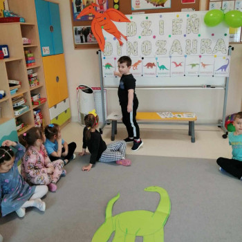 Dinozaury to stworzenia, które fascynują dzieci oraz kryją wiele tajemnic, dlatego też w Dniu Dinozaura nasze przedszkolaki poznały ich historię. Dzieci uczestniczyły w zabawach muzyczno-ruchowych, karmiły dinozaura, układały puzzle, memory, domino. Z dużym zaciekawieniem oglądały film edukacyjny o dinozaurach oraz wykonywały prace plastyczne. W ten sposób dowiedziały się jak wyglądały dinozaury, kiedy żyły, czym się żywiły oraz jak się nazywały. Był to dzień pełen niezapomnianych wrażeń, który na długo pozostanie w ich pamięci.