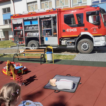W dniu 28 maja dzieci z wielką radością powitały wyjątkowych gości - strażaków z Ochotniczej Straży Pożarnej w Małogoszczu, którzy opowiedzieli przedszkolakom o swojej codziennej pracy. Dzieci dowiedziały się również iż praca strażaka nie polega tylko na gaszeniu pożarów, ale także na udzielaniu pierwszej pomocy ludziom poszkodowanym w wypadkach. Przedszkolaki miały możliwość obejrzeć wyposażenie wozu strażackiego oraz uczestniczyć w instruktarzu udzielania pierwszej pomocy.