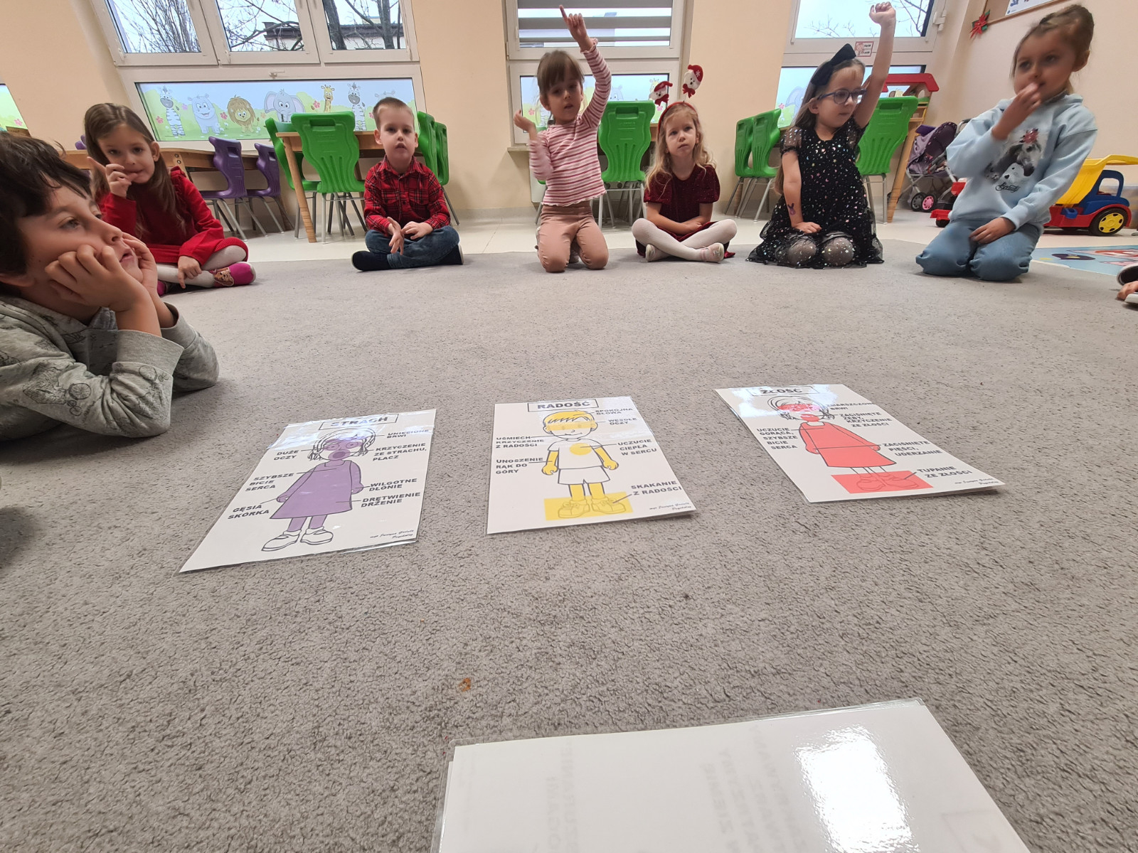 Na zajęciach rozmawialiśmy o tym gdzie w ciele odczuwamy emocje oraz jak rozpoznać siebie jaką emocję odczuwamy a także jak rozpoznać osobę, która daną emocję odczuwa. Przedstawione zostały obrazki, na których widoczne są twarze osób oraz oznaczone części ciała, w których dana emocja daje nam o sobie znać. Dzieci bardzo chętnie brały udział i odnosiły się do swoich przeżyć.