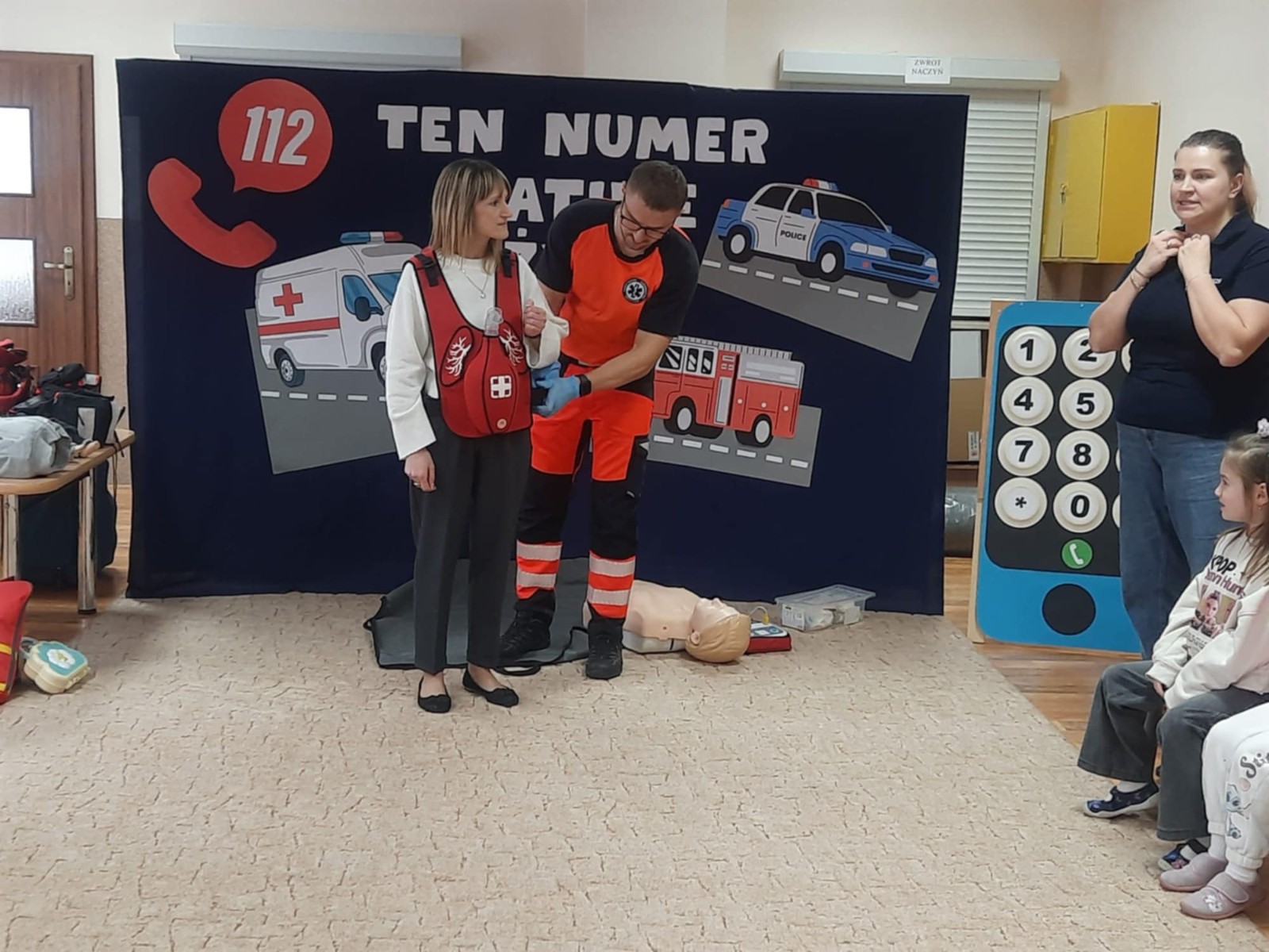 W naszym przedszkolu odbyły się zajęcia edukacyjne z okazji zbliżającego się Dnia Numeru Alarmowego 112. W wydarzeniu uczestniczyli zaproszeni Ratownicy Medyczni rodzice Józia z grupy „Zajączki” - Pani Justyna i Pan Marcin Augustowscy, którzy przeprowadzili prelekcję na temat udzielania pierwszej pomocy oraz zasad prawidłowego wzywania pomocy w sytuacjach zagrożenia zdrowia i życia.