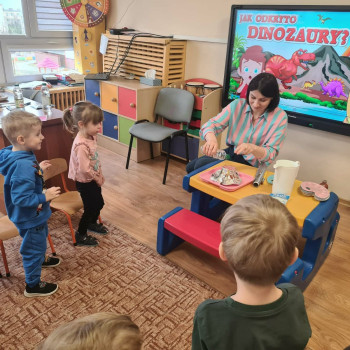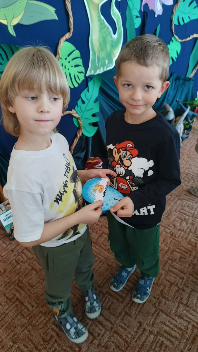 Dzień Dinozaura to zawsze bardzo wyczekiwany moment przez każdego przedszkolaka. Mali paleontolodzy tego dnia z zainteresowaniem odkrywali tajemnice dawnych mieszkańców Ziemi, poszukiwali „skamielin” ukrytych w piasku i lodzie, dopasowywali szkielety dinozaurów z przygotowanych elementów, brali udział w zabawach ruchowych, uczestniczyli w quizach i zagadkach tematycznych. Zabawy dostarczyły dzieciom wiele radości, a jednocześnie rozwijały ich spostrzegawczość, sprawność manualną oraz umiejętność współpracy.